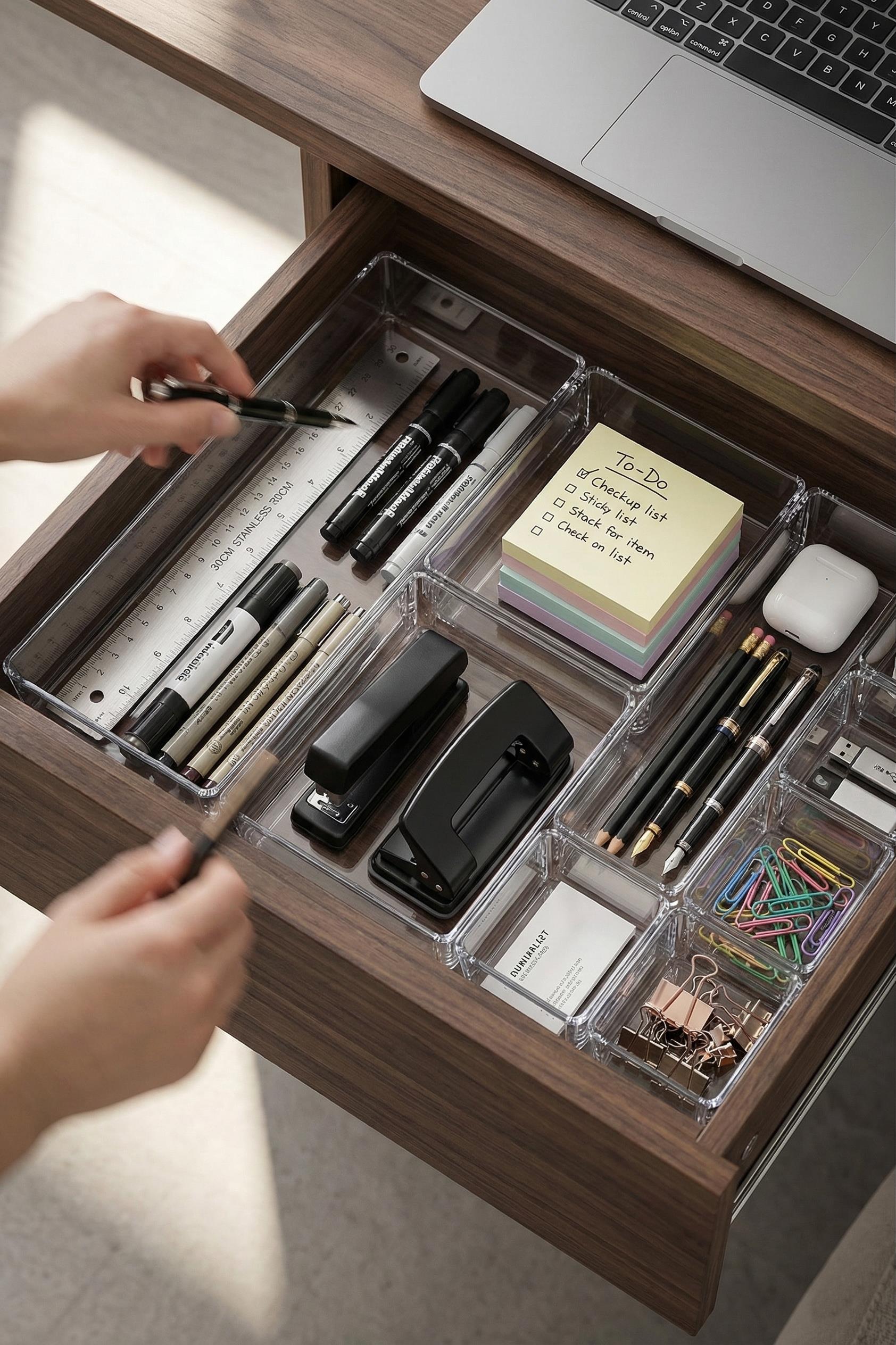 - Kristal Şeffaf Akrilik: Yüksek kaliteli şeffaf materyali, aradığınız ürünü saniyeler içinde bulmanızı sağlarken masanıza ve çekmecenize lüks bir görünüm katar.