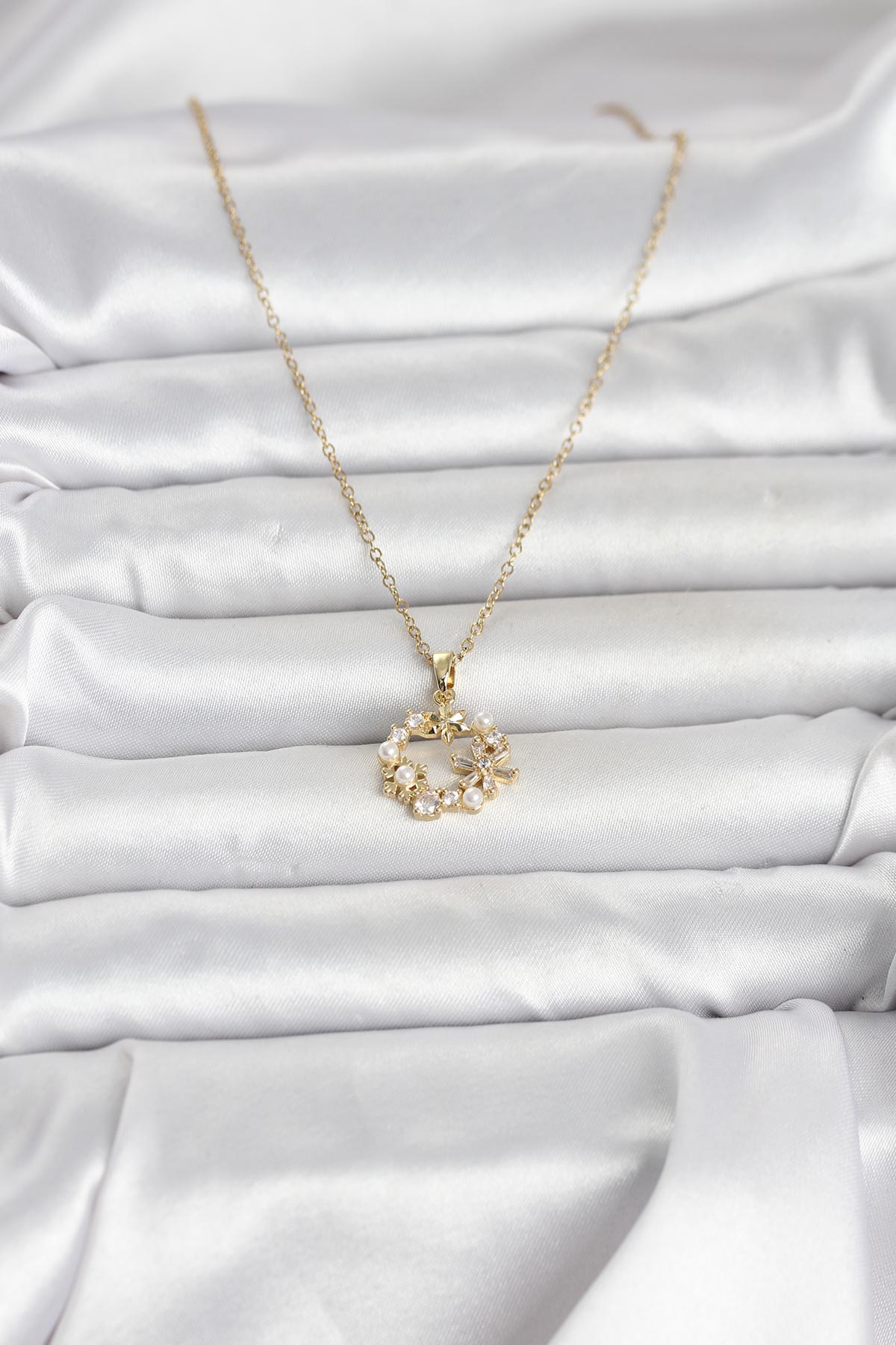 316L Çelik Zincir Gold Renk İncili Çiçek Model Kadın Koyle