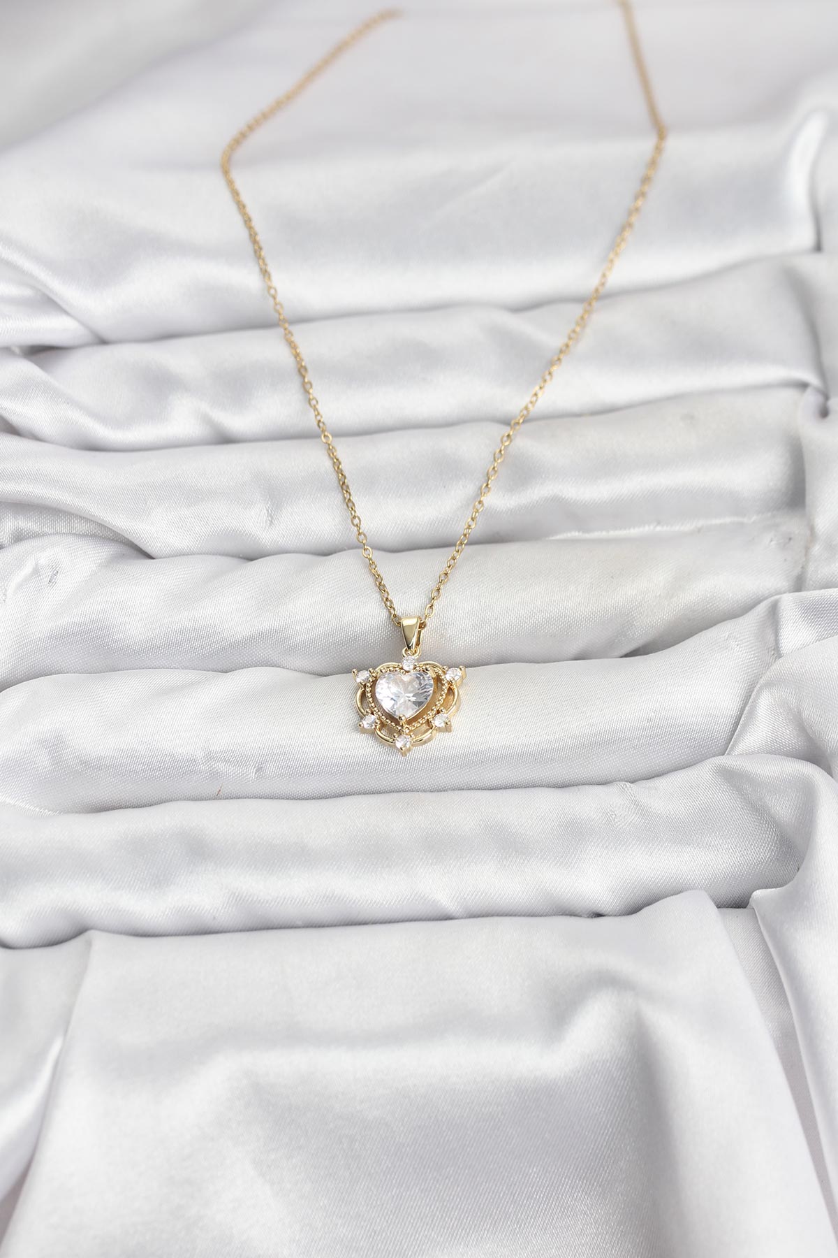316L Çelik Zincir Gold Renk Kalp Model Zirkon Taşlı Kadın Kolye