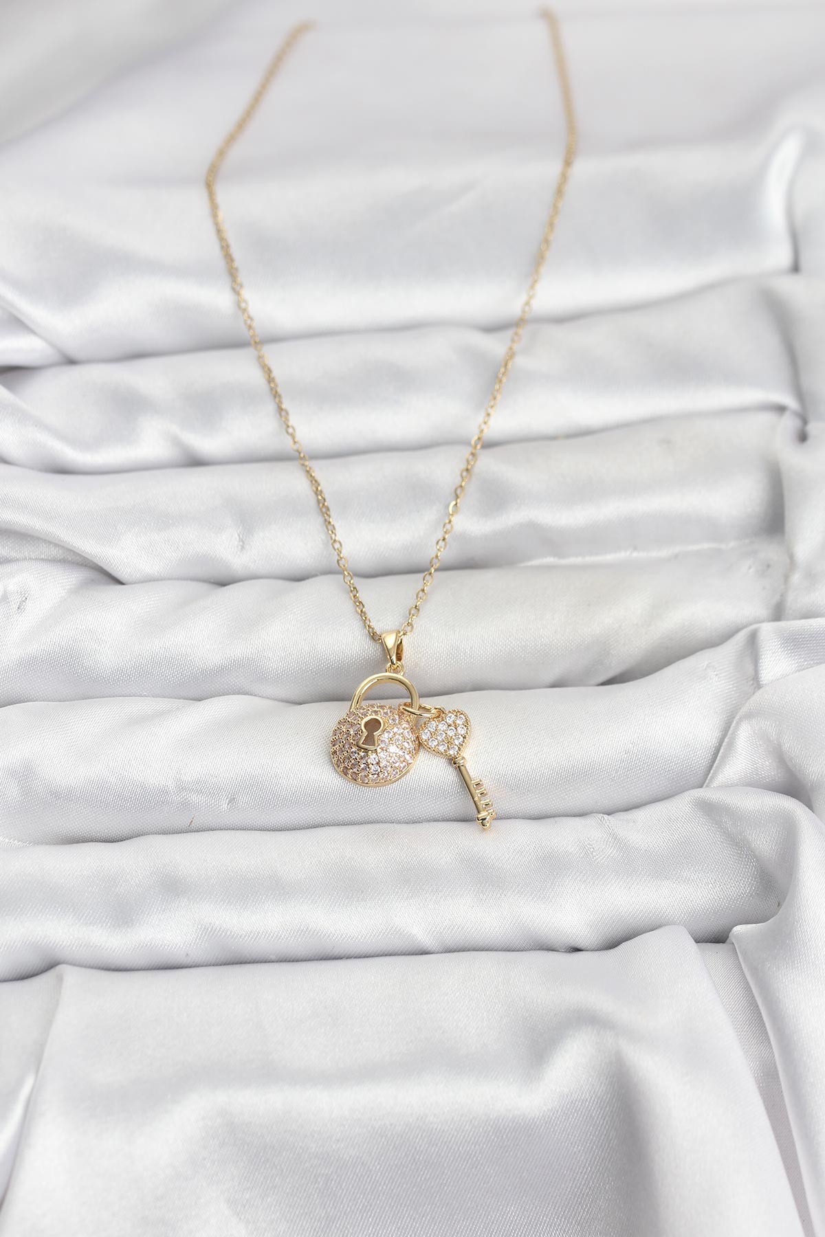 316L Çelik Zincir Gold Renk Kilit Anahtar Model Zirkon Taşlı Kadın Kolye
