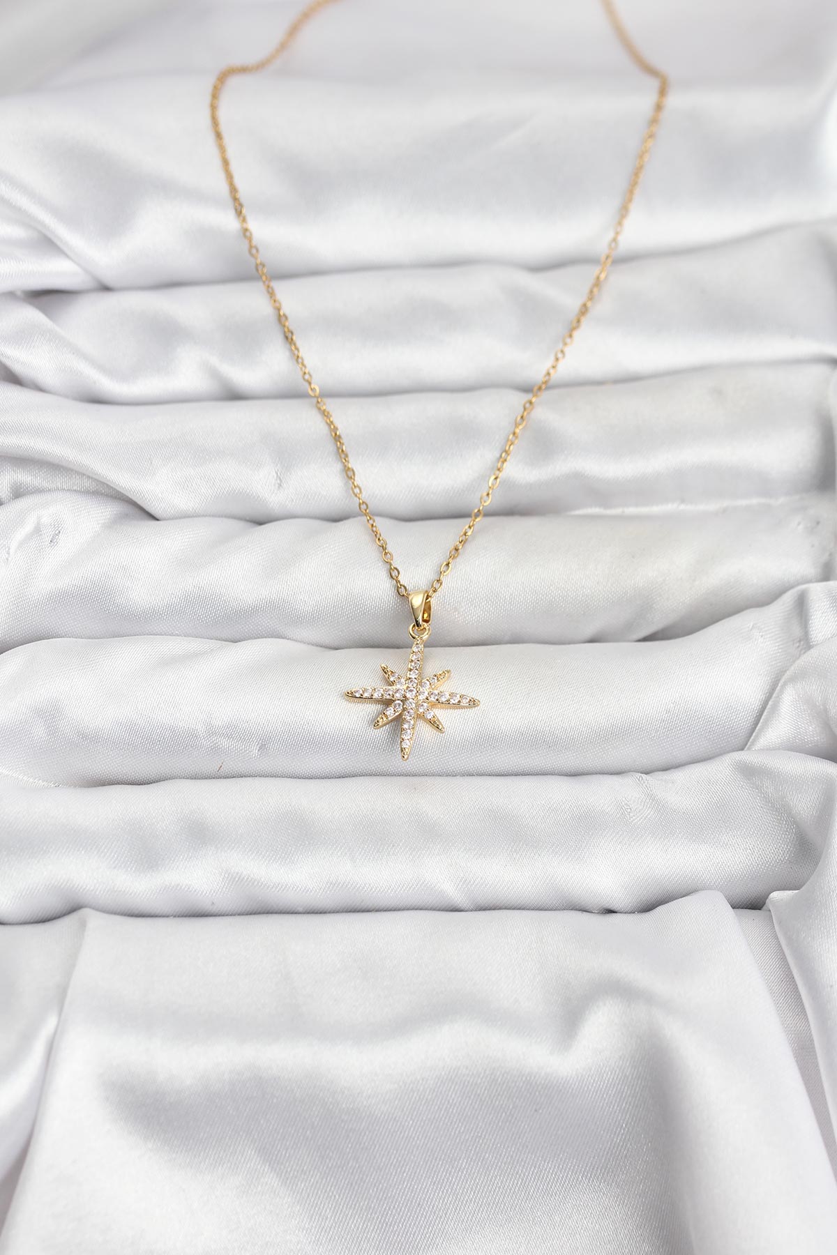 316L Çelik Zincir Gold Renk Kutup Yıldızı Model Zirkon Taşlı Kadın Kolye