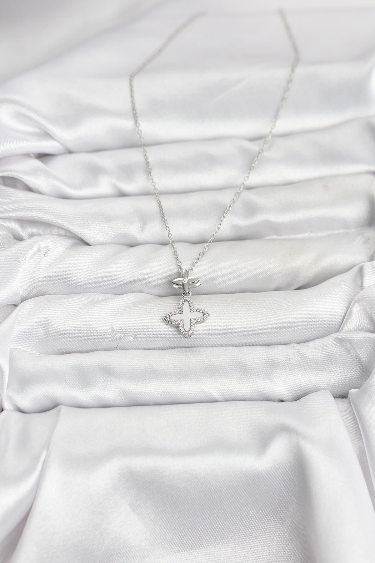 316L Çelik Zincir Gümüş Renk 4 Yapraklı Yonca Model Zirkon Taşlı Kadın Kolye