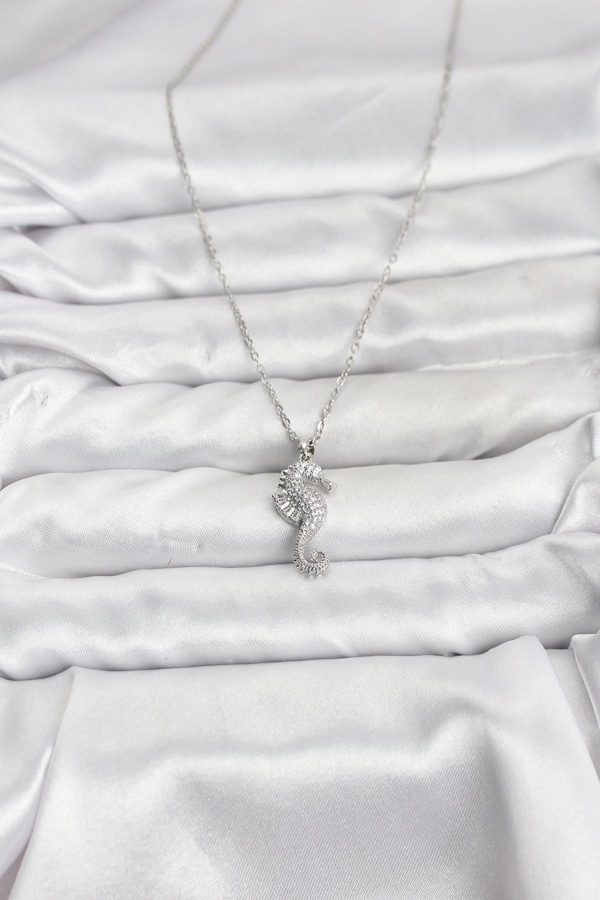 316L Çelik Zincir Gümüş Renk Deniz Atı Model Zirkon Taşlı Kadın Kolye