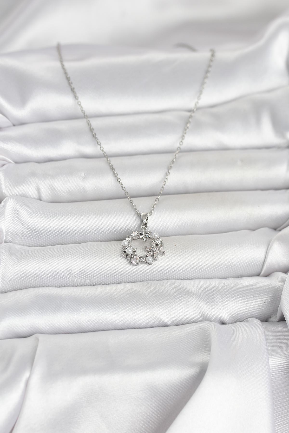 316L Çelik Zincir Gümüş Renk İncili Çiçek Model Kadın Koyle