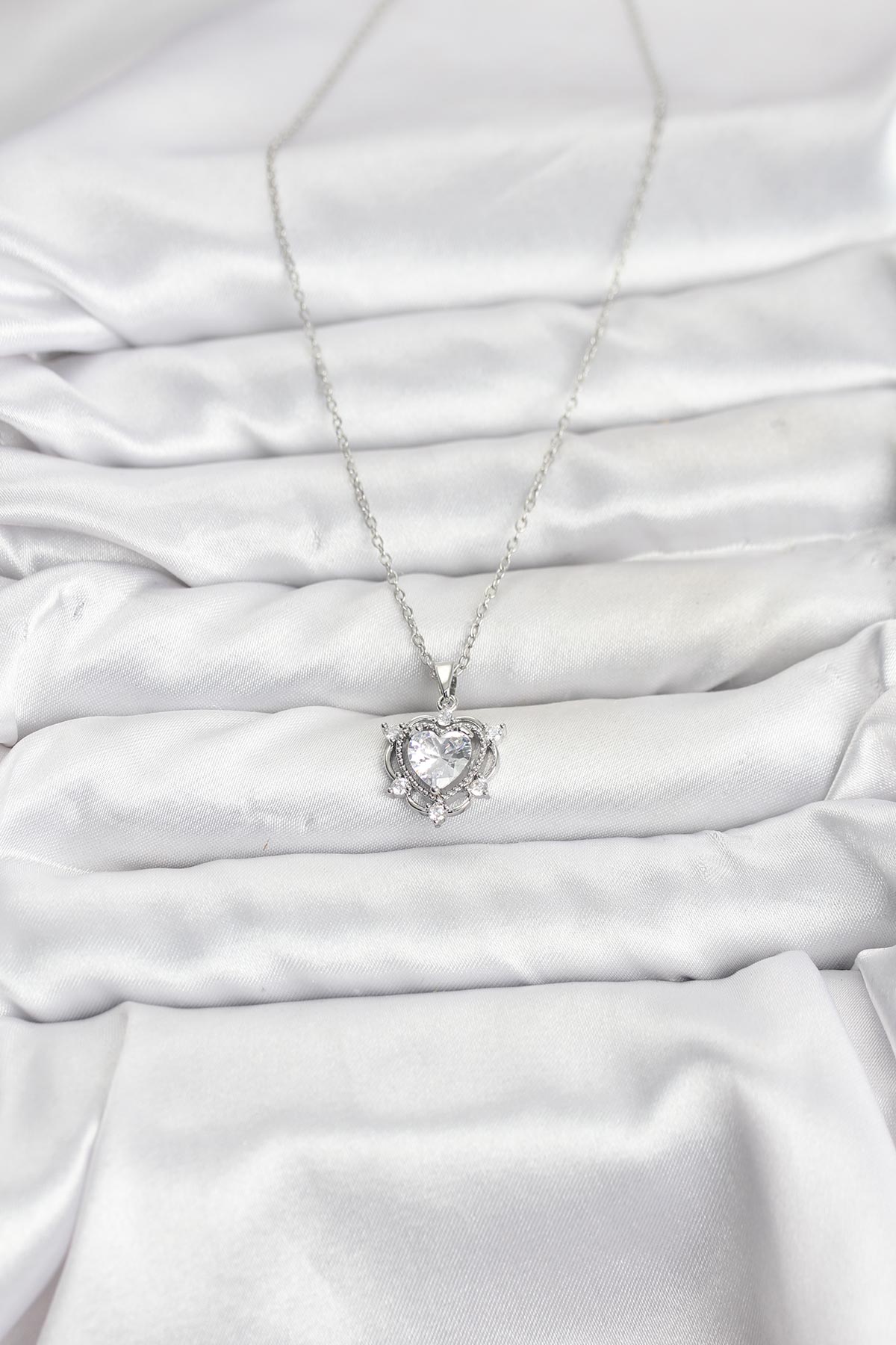 316L Çelik Zincir Gümüş Renk Kalp Model Zirkon Taşlı Kadın Kolye