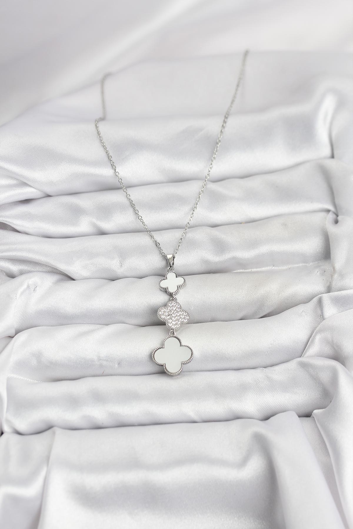 316L Çelik Zincir Gümüş Renk Yonca Detaylı Zirkon Taşlı Kadın Kolye