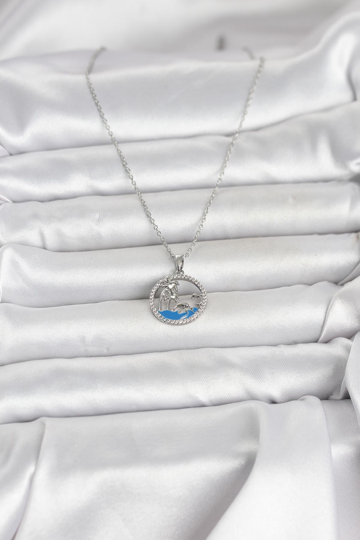 316L Çelik Zincir Gümüş Renk Zirkon Taşlı Deniz Temalı Kadın Kolye