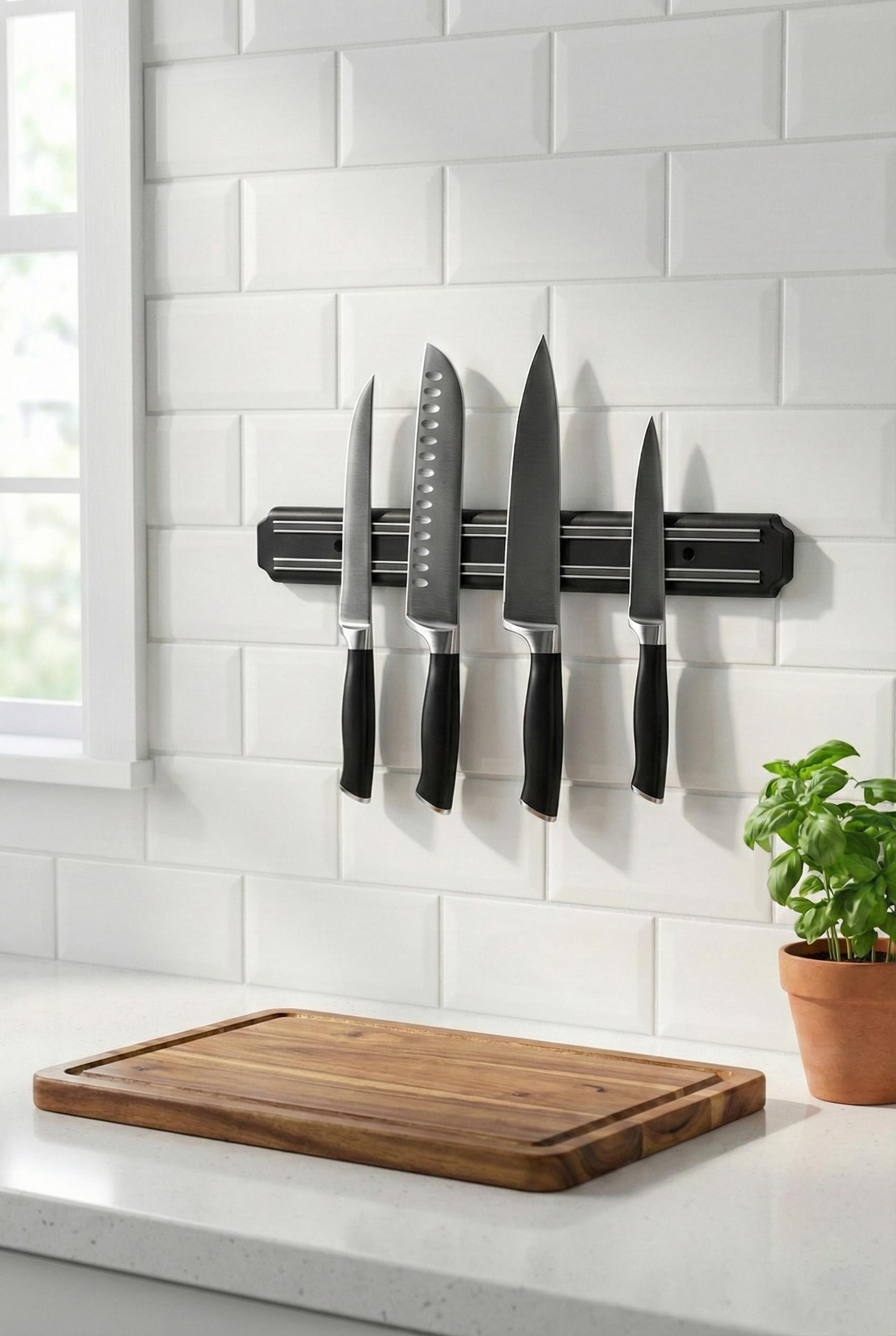 - Güçlü Manyetik Şerit: Bıçaklarınızı ve metal mutfak gereçlerinizi düşme riski olmadan sıkıca tutar.
