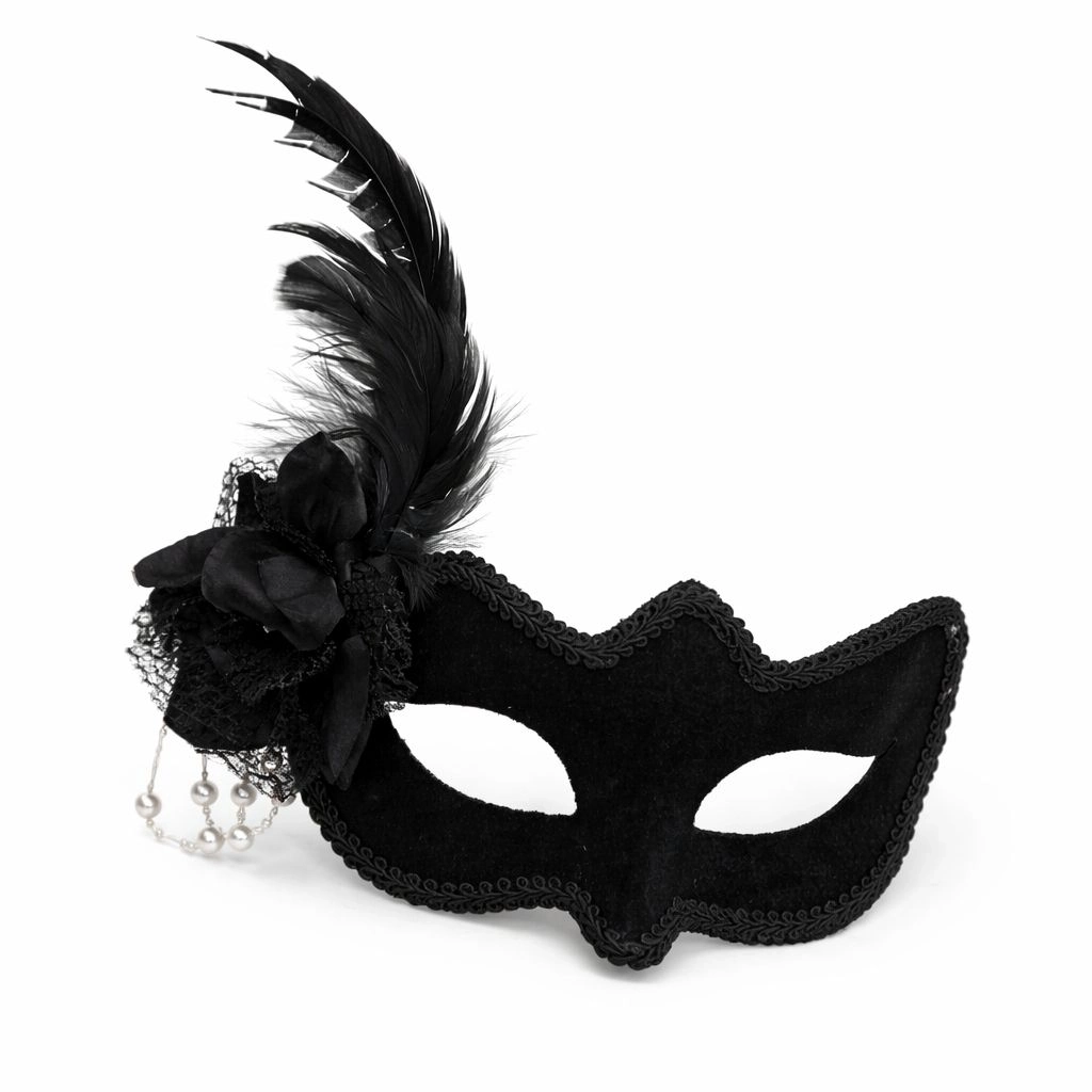 Beyaz İnci Detaylı Siyah Süet Venedik Kadın Maskesi Tüylü Güllü