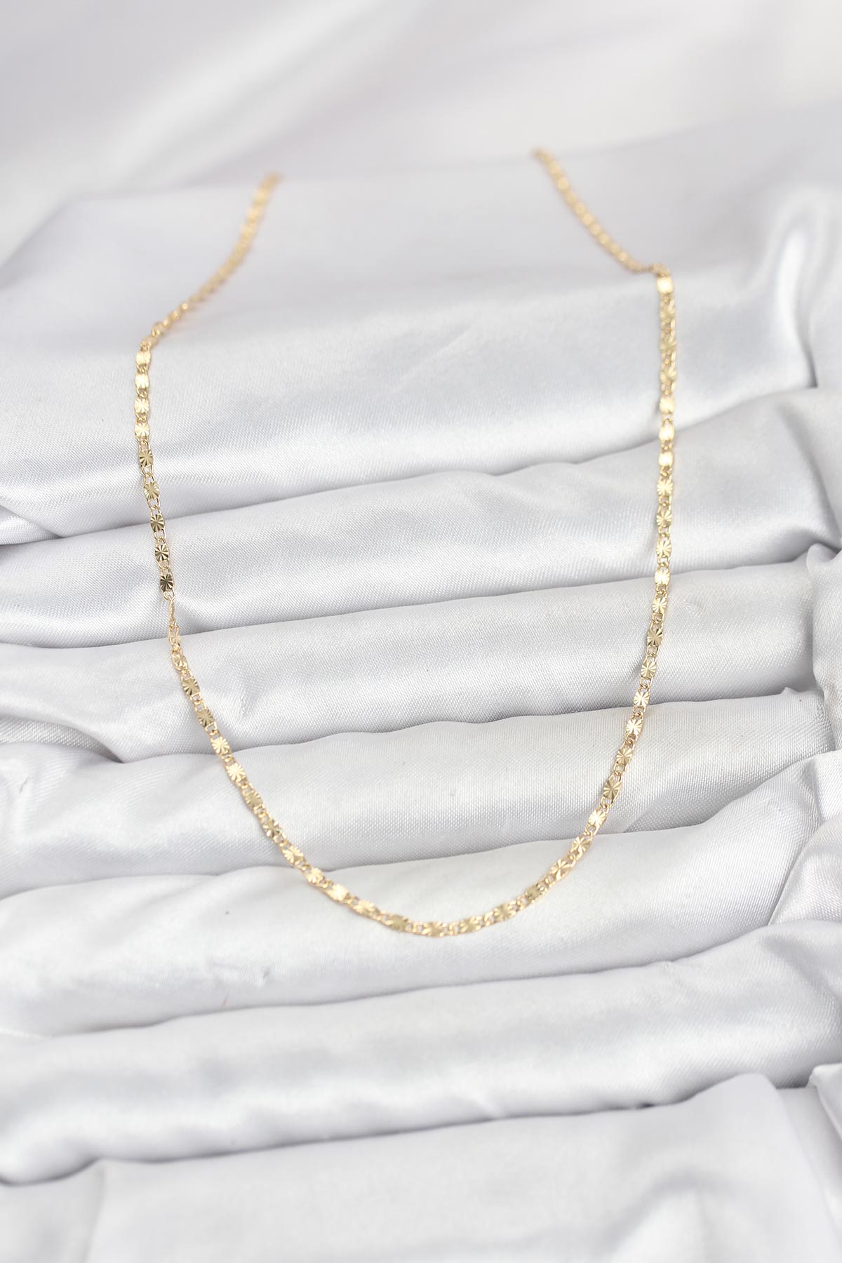 -Uzunluk: 45 cm uzunluğundadır-Materyal: Dayanıklı pirinç materyal üzerine 1. Sınıf 14K Gold (Altın) Rengi Kaplama uygulanmıştır.-Dayanıklılık: Doğru ve özenli kullanımda kararma ve renk solmasına karşı dirençlidir.-Kullanım Önerisi: Ürününüzün ışıltısını ve kaplama kalitesini uzun yıllar koruyabilmesi için parfüm, su, deterjan ve kimyasal maddelerle doğrudan temasından kaçınmanızı öneririz.-Cilt Uyarısı: Her cilt yapısının metal ve kaplamalara vereceği tepki (pH değerine bağlı olarak) farklılık gösterebilir.-Sağlıklı ve mutlu günlerde kullanmanız dileğiyle.