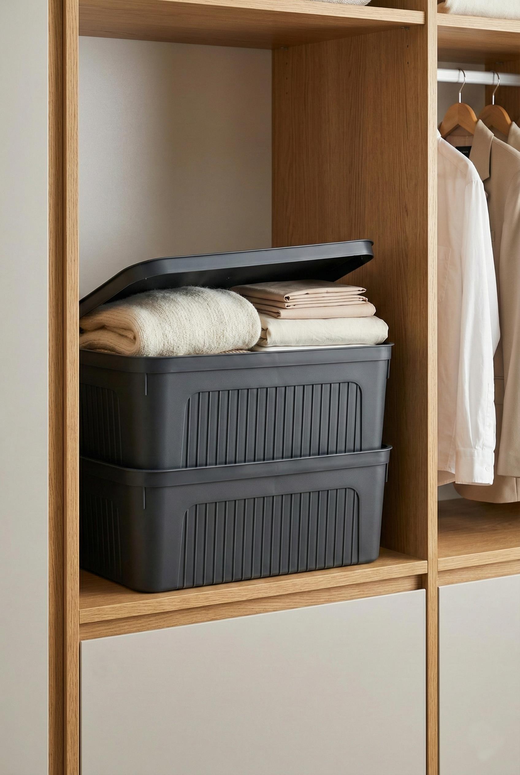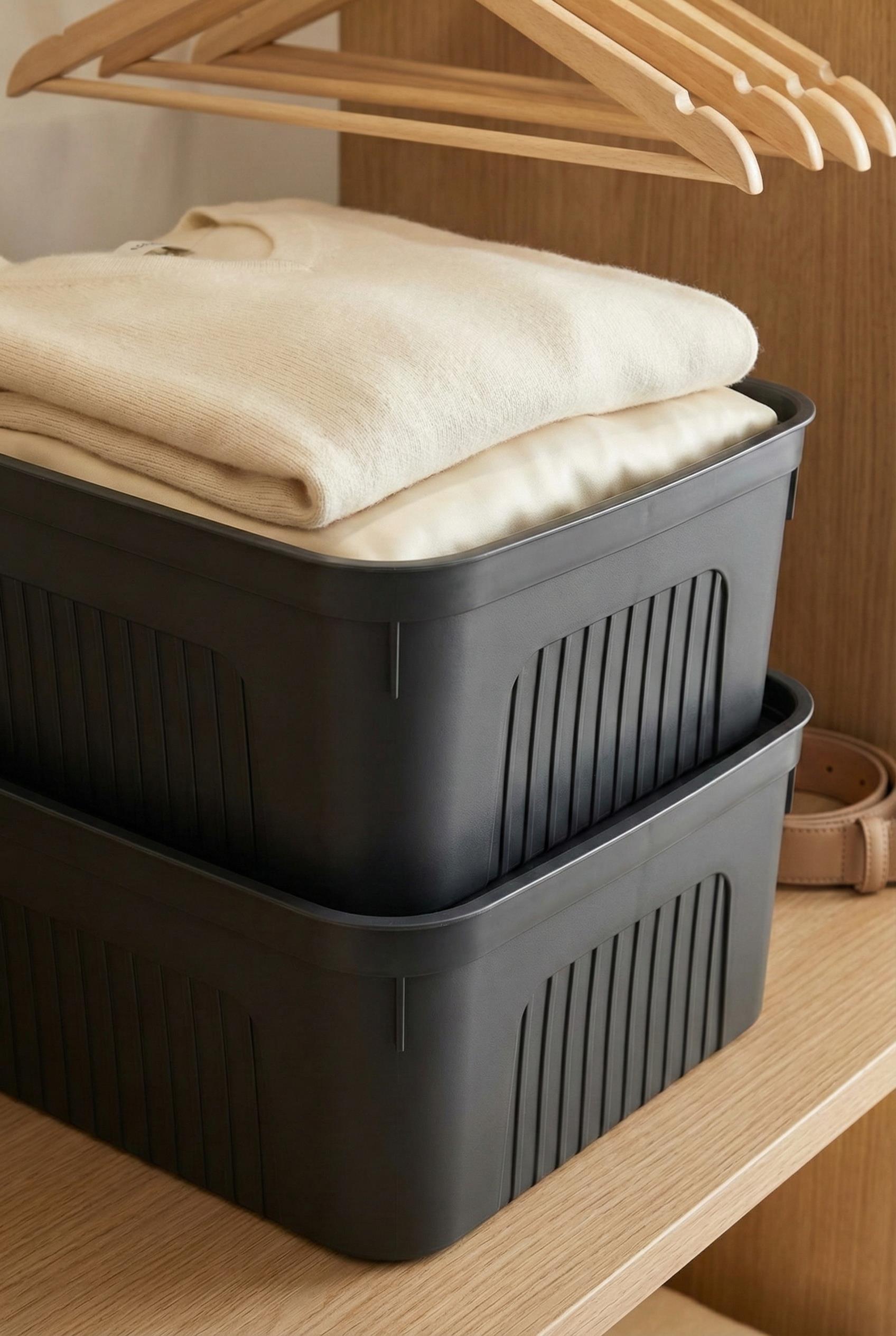 Evinizde ve gardırobunuzda geniş hacimli bir düzen sağlayan bu 17 litrelik ikili saklama kutusu seti, modern füme rengi ve kapaklı tasarımıyla kıyafetlerinizden büyük boy mutfak gereçlerinize kadar her şeyi güvenle muhafaza eder.