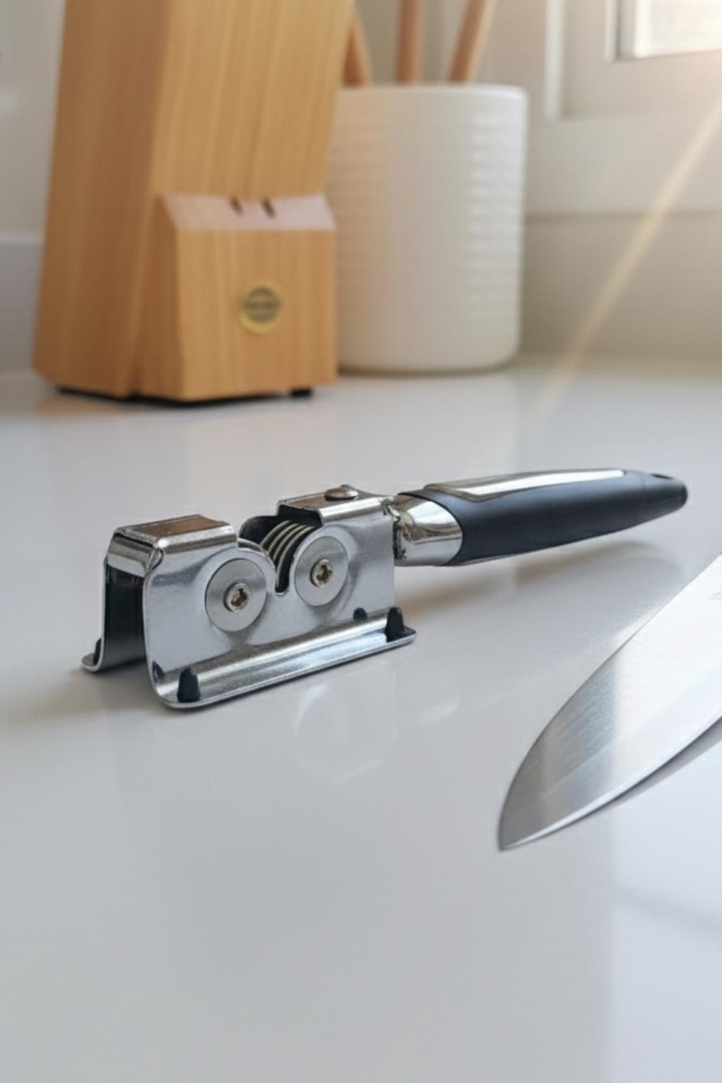 Ürün Hikayesi: Mutfaklarda pratiklik ve keskinlik isteyenler için tasarlanan paslanmaz çelik bıçak bileyici, bıçaklarınıza kısa sürede yeni bir keskinlik kazandırır. Siyah ergonomik sapı sayesinde kolay kavranır, mutfak tezgâhınızda güvenle kullanılabilir.