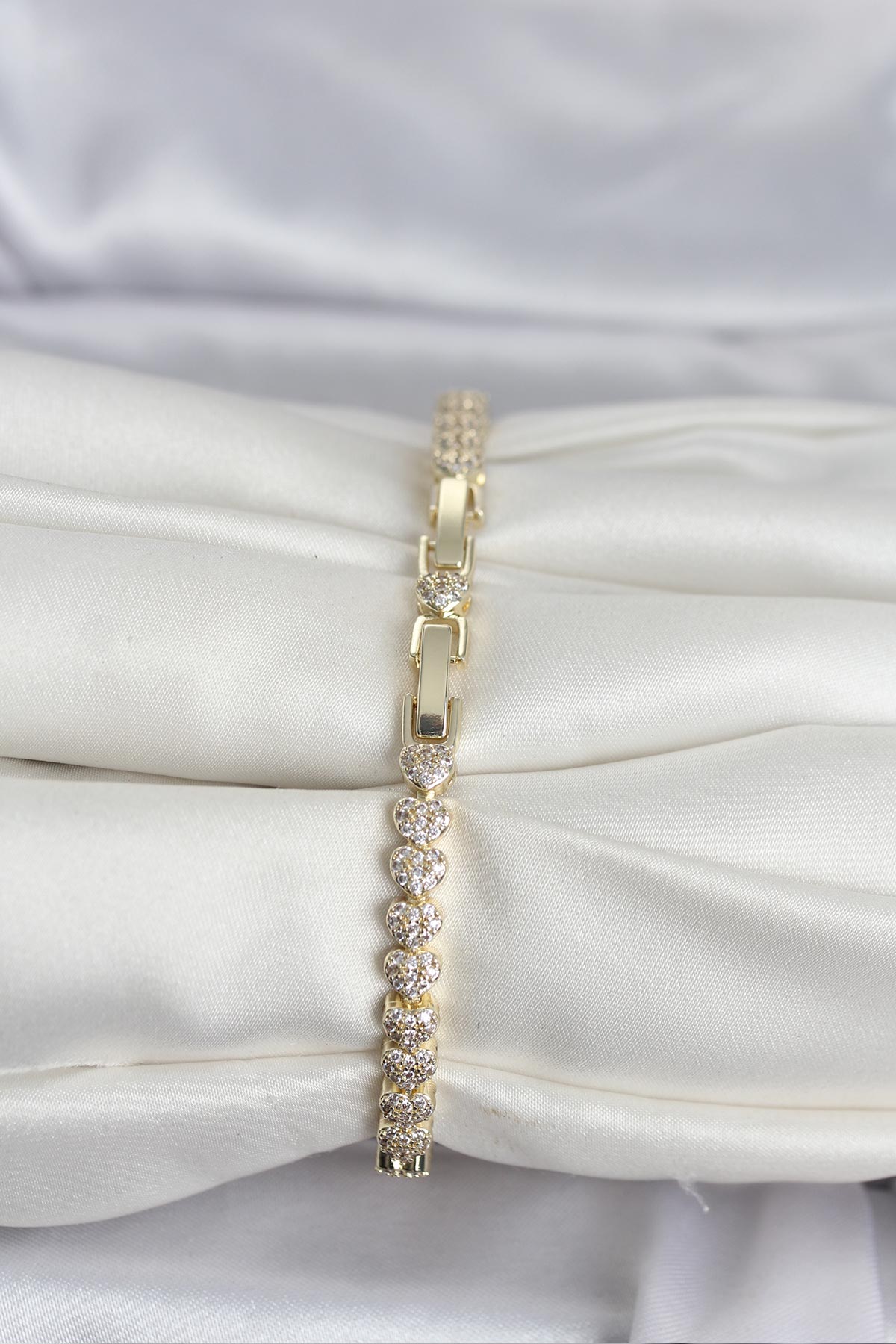 Pirinç Gold Renk Kalp Model Sıralı Zirkon Taşlı Kadın Bileklik