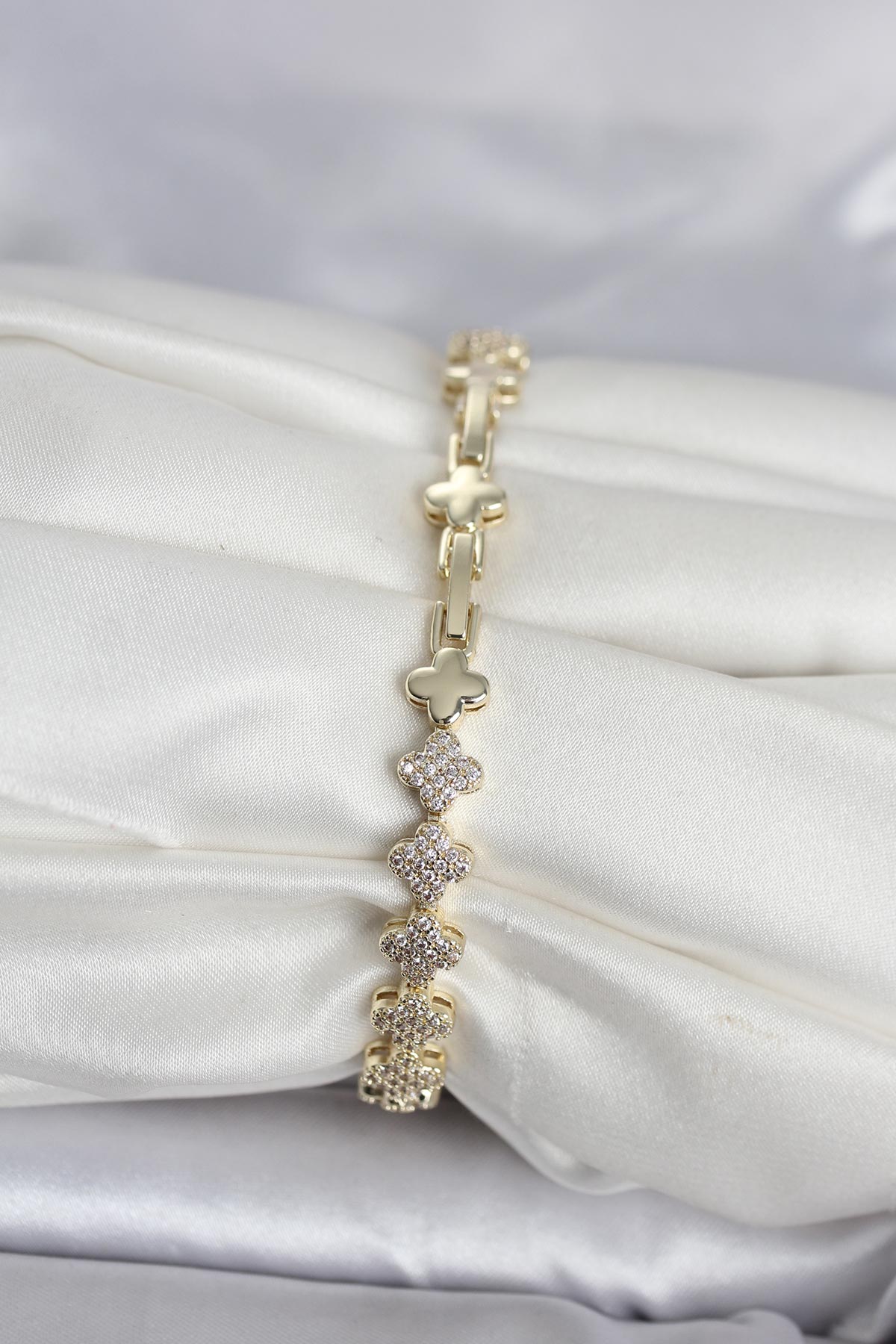 Pirinç Gold Renk Yonca Model Sıralı Zirkon Taşlı Kadın Bileklik