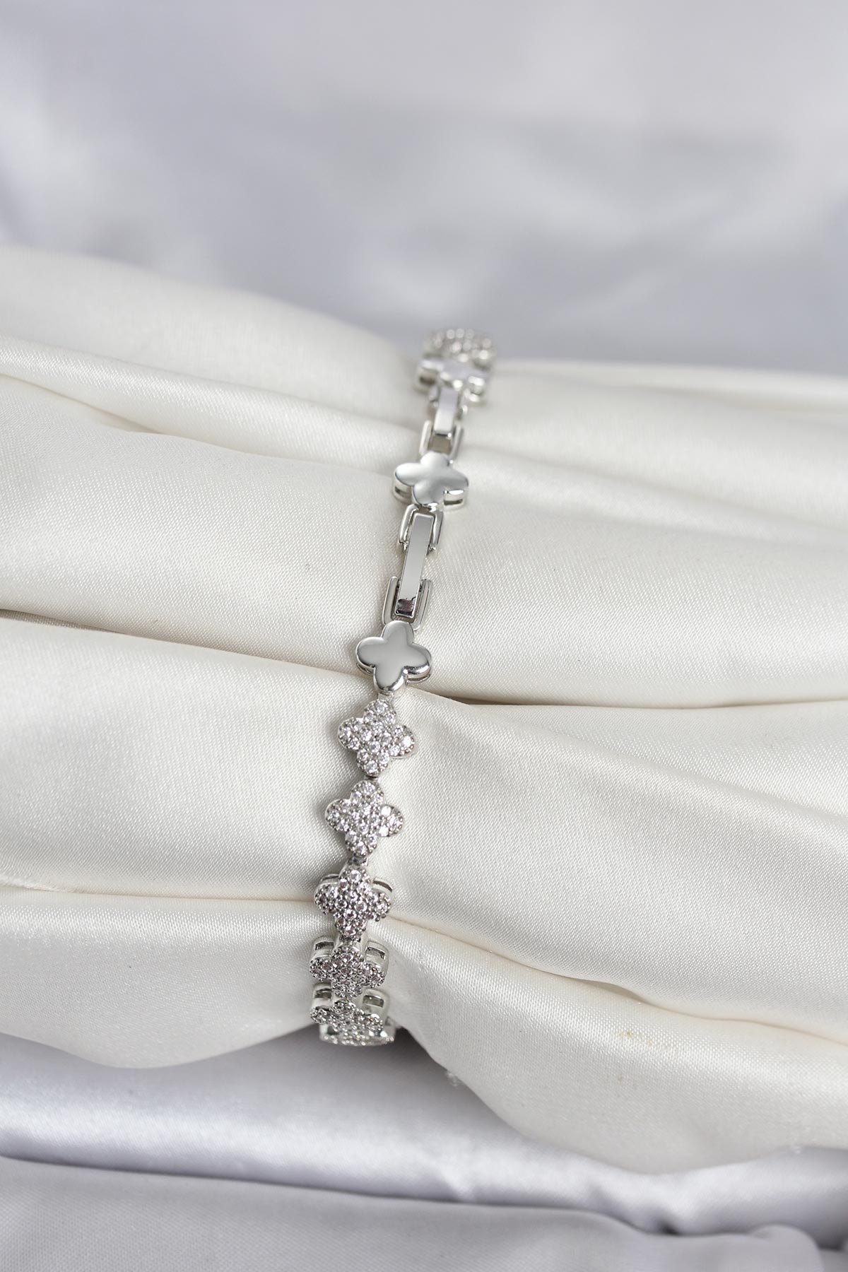 Pirinç Gümüş Renk Yonca Model Sıralı Zirkon Taşlı Kadın Bileklik