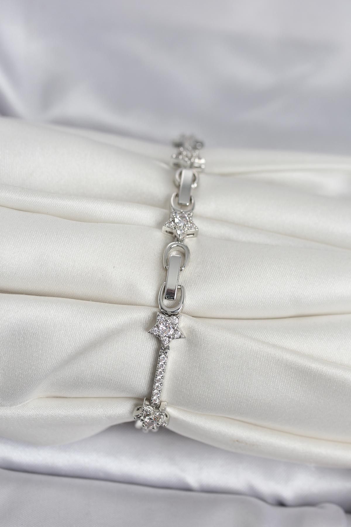 Pirinç Gümüş Renk Zirkon Taşlı Yıldız Model Kadın Bileklik