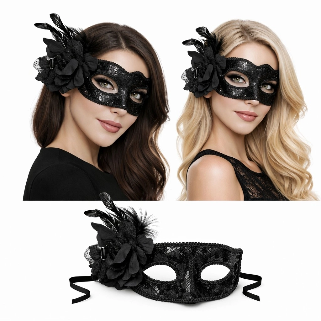 Siyah Venedik Parti Maskesi – Çiçekli Tüylü Payetli