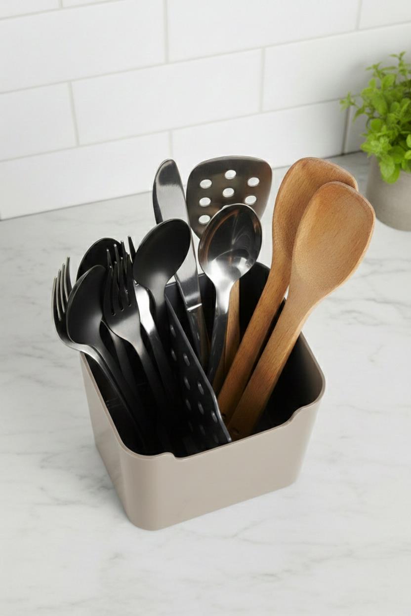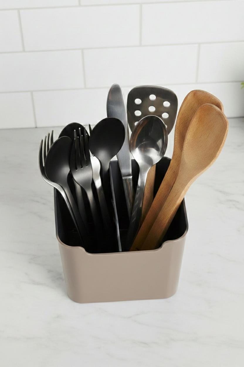 Mutfağınızda karmaşaya son veren bu vizon renkli 2 bölmeli kaşıklık, kompakt tasarımıyla servis gereçlerinizi ve çatal-bıçaklarınızı elinizin altında düzenli bir şekilde tutar.