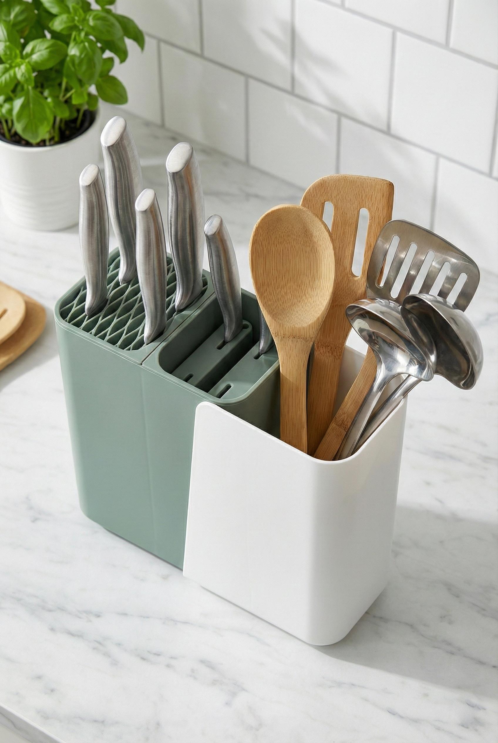 Yeşil Sürgülü Dik Kaşıklık & Fonksiyonel Bıçaklık Ve Mutfak Düzenleyici 9x17x21 cm
